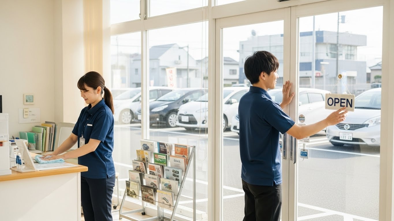 9:00〜開店準備: 予約表確認、キー・書類セット準備。当日の貸出予定車両をチェックし、洗車や給油が必要な車両を確認します。