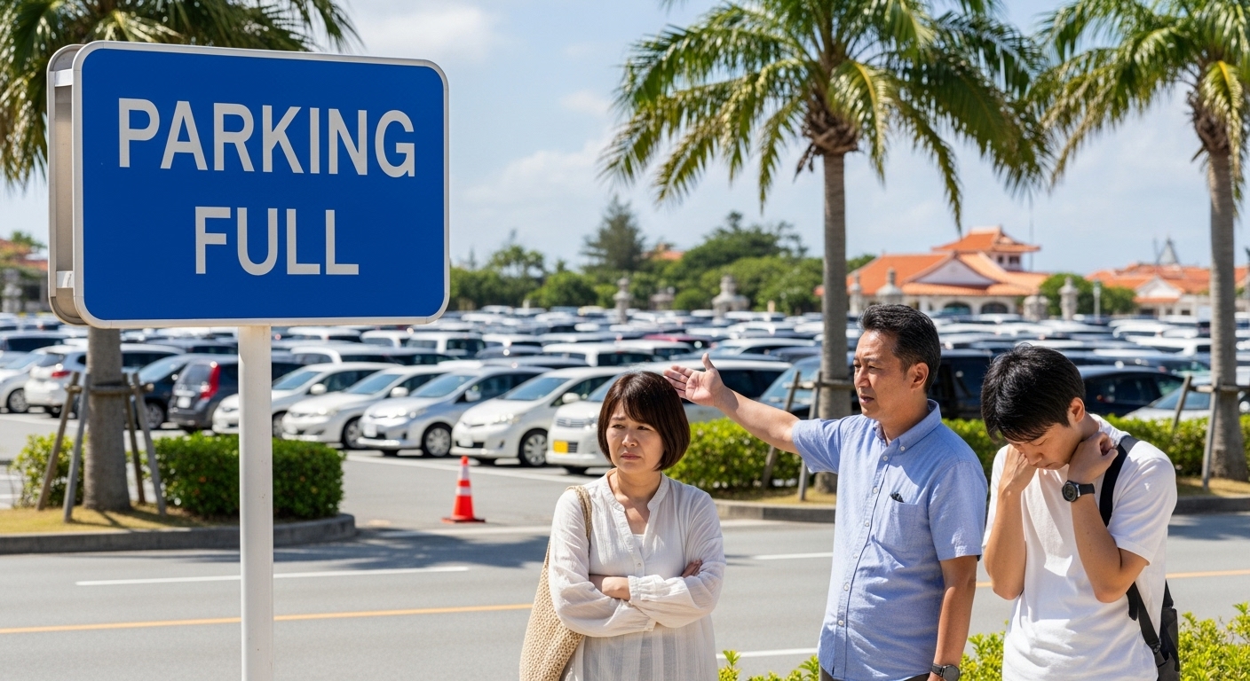 沖縄レンタカーで観光施設の駐車場が満車だった場合の正しい対処法を、「その場を離れる→代替駐車場を探す→違法駐車をしない」の3ステップで解説します。